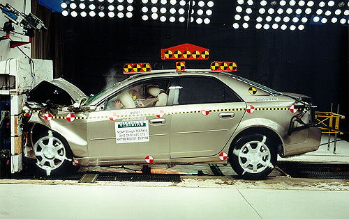 They ram the cars into barriers, and vice-versa. Both the Insurance Institute and the National Highway Traffic Safety Administration use front- and side-impact tests to rate new cars. For the front crash, the vehicles are propelled into fixed barriers that are designed to crumple the way the front of a real car might. For the side crash, the car stands still while a crushable barrier is propelled into its side.