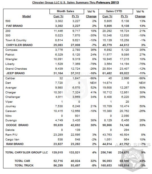While Chrysler Group extended its streak of year-over-year sales gains in February to 35-consecutive months, sales and shipment volumes for the first quarter of 2013 are being negatively affected by the end of Jeep Liberty production in Q3 2012 and the on-going product launches during the quarter of the new 2014 Jeep Grand Cherokee, the Jeep Compass, and the new 2013 Ram Heavy Duty truck line. As the Chairman and CEO of Chrysler Group LLC, Sergio Marchionne, pointed out in the 2012 Q4 and full-year earnings call at the end of January, due to the aforementioned vehicle launches, Chrysler Group's first-quarter volumes are expected to be lower than the volumes reached during the same quarter in 2012.