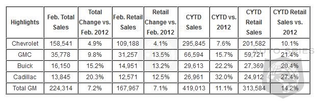 General Motors Co. (NYSE: GM) announced today that it sold 224,314 vehicles in the United States in February, up 7 percent compared with a year ago. Retail sales and fleet sales were both up 7 percent. The fleet mix was 25 percent of total sales, equal to a year ago. “The housing sector has now joined auto sales in propelling the U.S. economy forward,” said Kurt McNeil, vice president of U.S. sales operations. “More importantly, the recovery in new home construction is reinforcing the underlying improvement in auto buying conditions, especially for pickups.
