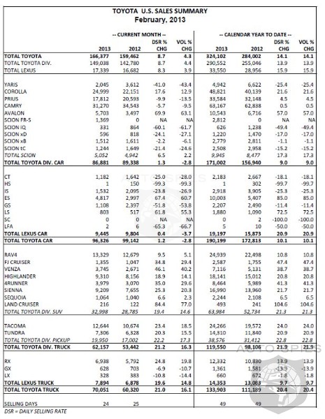 Toyota Motor Sales (TMS), U.S.A., Inc., today reported February 2013 sales results of 166,377 units, an increase of 8.7 percent on a daily selling rate (DSR) basis. Unadjusted for 24 selling days in February 2013 versus 25 in February 2012, TMS sales were up 4.3 percent over the year-ago month.