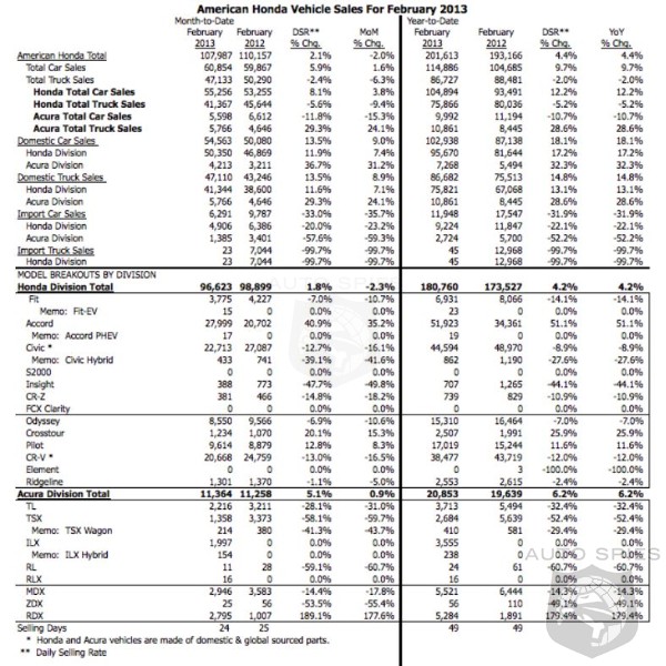 American Honda today reported February 2013 U.S. sales of 107,987 units, overcoming winter's worst to post a decrease of only 2.0 percent compared with February 2012 (an increase of 2.1 percent based on the Daily Selling Rate (DSR*)), and enabling year-to-date sales to remain up over 2012. Reflecting Honda's unique focus on retail sales, and real demand for top-rated products such as Accord, the Honda brand posted February 2013 sales of 96,623 units, a decrease of 2.3 percent compared with February 2012 (an increase of 1.8 percent based on the DSR). Acura U.S. February sales of 11,364 units increased 0.9 percent compared with February 2012 (an increase of 5.1 percent based on the DSR).