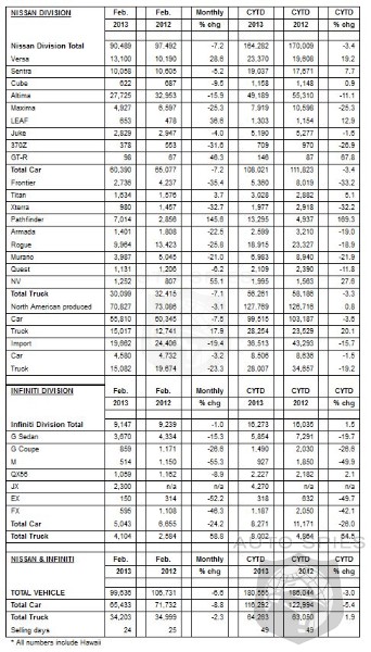 NOTE: To ensure consistency in global sales reporting, Nissan North America calculates monthly variances on a straight-percentage basis, unadjusted for the number of selling days. February had 24 selling days in 2013 and 25 selling days in 2012.