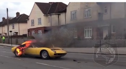 A yellow Miura SV succumbed to supercaritis in the middle of a seemingly main road. For the uninitiated, supercaritis is what happens when an Italian exotic bursts into flames for no apparent reason.
