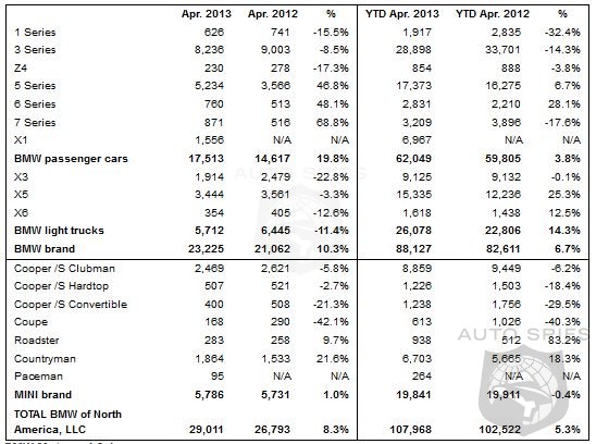 Sales of BMW brand vehicles increased 10.3 percent in April for a total of 23,225 compared to 21,062 vehicles sold in April, 2012. Year-to-date, the BMW brand is up 6.7 percent on sales of 88,127 compared to 82,611 sold in the first four months of 2012.