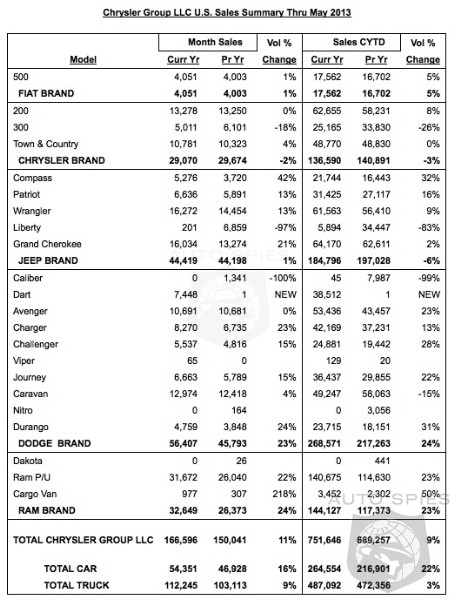 Chrysler Group LLC today reported U.S. sales of 166,596 units, an 11 percent increase compared with sales in May 2012 (150,041 units), and the group's best May sales since 2007.