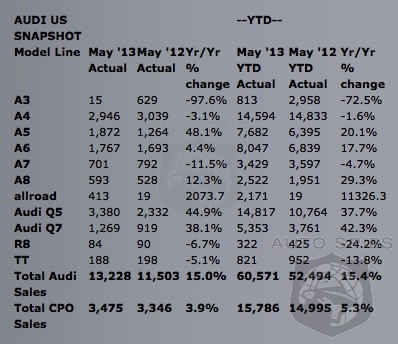 • Sales mix for Audi TDI clean diesel models finish the month at 13% for the A3 TDI, 11% for the A8 TDI and 26% for the Q7 TDI. A3 sales in May 2013 were down substantially as the brand prepares for the arrival of the all-new A3 sedan in early 2014.