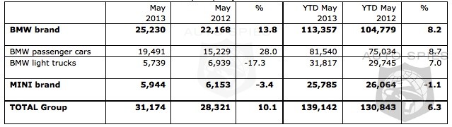 The BMW Group in the U.S. (BMW and MINI combined) reported May sales of 31,174 vehicles, an increase of 10.1 percent from the 28,321 vehicles sold in the same month a year ago. Year-to-date, the BMW Group (BMW and MINI combined) is up 6.3 percent on sales of 139,142 in the first five months of 2013 compared to 130,843 in the same period in 2012.