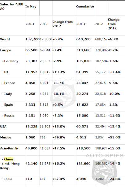China remains the largest market for Audi, where the Germans sold 42,140 vehicles – up 16.2 percent from 36,278 sold in May 2012. From January through May, Audi sold 183,660 units in China, for growth of 14.4 percent.