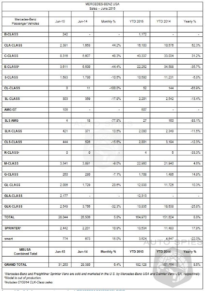 Mercedes-Benz USA (MBUSA) today reported combined sales of 27,162 for June, a 7.0% increase over the same month last year. Sales totals at Mercedes-Benz rose 9.8% to 24,415, bringing year-to-date volumes for the brand to a milestone 141,950 units. Sprinter Vans posted strong year-to-date sales of 9,483, which combined with year-to-date sales of 4,459 from smart to bring MBUSA's first-half total to 155,892. This marks the best second-quarter finish in the company's history and the sixth consecutive month of best-ever sales for 2013.