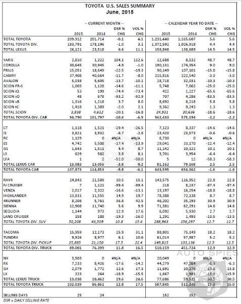 Lexus reported June 2013 sales of 21,355 units, up 10.8 percent on a DSR basis, and up 6.7 percent over last year on a raw volume basis.