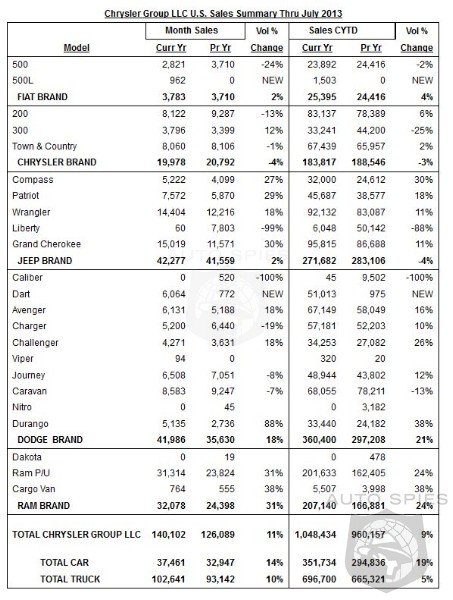 Chrysler Group LLC today reported U.S. sales of 140,102 units, an 11 percent increase compared with sales in July 2012 (126,089 units), and the group's best July sales since 2006.