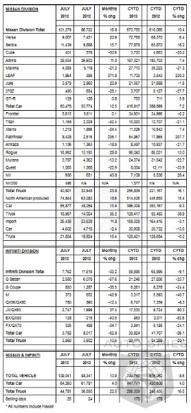 NOTE: To ensure consistency in global sales reporting, Nissan North America calculates monthly variances on a straight-percentage basis, unadjusted for the number of selling days. July 2013 had 25 selling days, while July 2012 had 24 selling days.