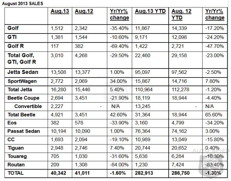 The Tiguan had the best August ever with 2,948 units sold; this also marks the best year-to-date with 20,744 units. Total sales of the Golf (including Golf R and GTI) were 3,010 units. The Touareg sold 705 units.