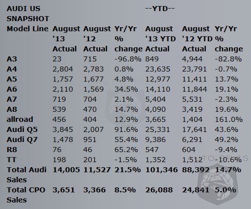 • Audi sold 456 allroad models in August 2013, bringing YTD sales to 3,665 of the sport wagon, a 161.0% increase compared to previous period.