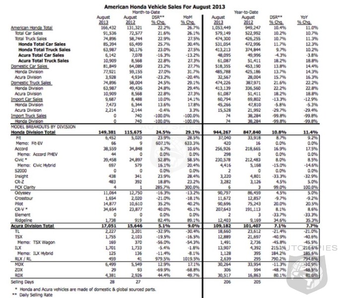 Setting a new August record, American Honda Motor Co., Inc. today reported U.S. sales of 166,432 units, a total increase of 26.7 percent compared with a year ago (up 22.2 percent based on the Daily Selling Rate, or DSR*). Year-to-date sales of 1,053,449 units represent a year-over-year increase of 11.0 percent. The Honda Division posted August 2013 sales of 149,381 units, an increase of 29.1 percent compared with August 2012. Acura Division U.S. July sales of 17,051 units were up 9.0 percent compared with the prior year.