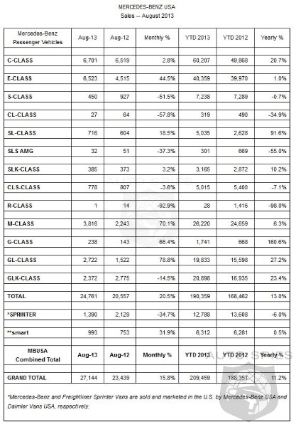 Mercedes-Benz USA (MBUSA) today reported August sales of 27,144 units, an increase of 15.8% from the 23,439 vehicles sold in August 2012 including Mercedes-Benz, Sprinter and smart models. Retail volumes for the Mercedes-Benz brand alone reached 24,761 for the month, up 20.5% from the previous year, while year-to-date sales climbed 13.0% to hit a record 190,359 units. Adding in year-to-date sales of 12,788 for Sprinter Vans and 6,312 units sold at smart brought MBUSA's year-to-date grand total to 209,459 vehicles, its highest on record.