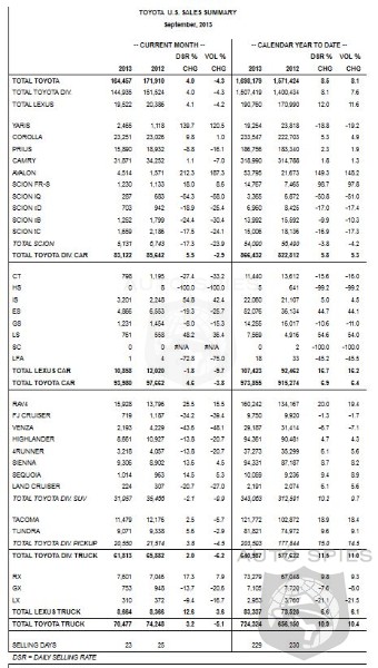 Toyota Motor Sales (TMS), U.S.A., Inc., today reported September 2013 sales results of 164,457 units, an increase of 4 percent over September 2012 on a daily selling rate (DSR) basis. On a raw-volume basis, unadjusted for 23 selling days in September 2013 versus 25 selling days in September 2012, TMS sales decreased 4.3 percent from year-ago month. Toyota Division posted September 2013 sales of 144,935 units, up 4 percent year-over-year on a DSR basis. Volume-wise, Toyota division sales decreased 4.3 percent over September 2012.