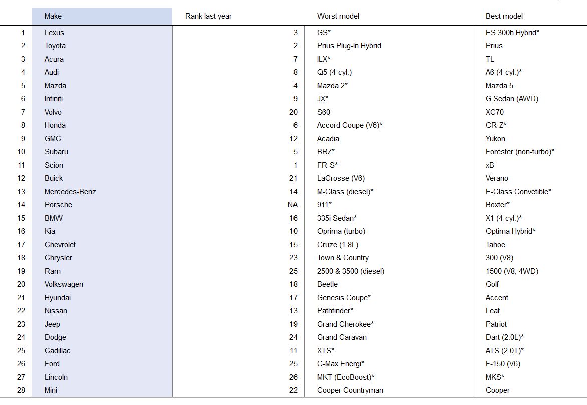reliability. Subaru and Scion, which also typically rank well in reliability, were torpedoed by their twin sports cars, the Subaru BRZ and the Scion FR-S, which scored below average. This dropped Subaru to 10th place, from last year's fifth. Scion, for which CR had only two models with sufficient data, sank from first place to 11th this time.
