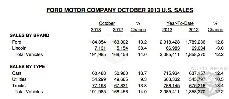 Ford Motor Company’s October U.S. total sales of 191,985 vehicles rose 14 percent over a year ago. Retail sales are up 15 percent, at 142,487 vehicles. It is the company’s best October retail sales performance since 2004.