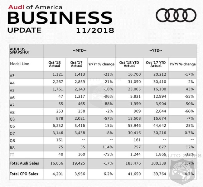 Sales of Audi premium category vehicles (Audi A6, Audi A7, Audi A8, and Audi Q7) increased 17% YTD, representing a steady 32.7% of total Audi sales year-to-date and 41% of the Audi year-to-date sales gain.