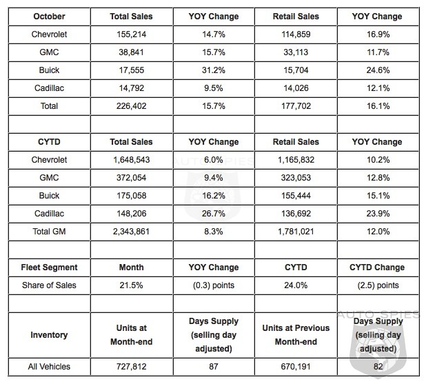 General Motors Co. (NYSE: GM) dealers delivered 226,402 vehicles in the United States in October, up 16 percent versus a year ago. Retail sales were also up 16 percent and fleet sales were up 14 percent. “Chevrolet, Cadillac and Buick-GMC all performed well in the month, and the sales tempo really picked up after the government shutdown ended,” said Kurt McNeil, vice president, U.S. sales operations. “We are particularly pleased with our truck momentum. Chevrolet and GMC have the newest and best light duty trucks, sales are accelerating and we are gearing up for the second, third and fourth phases of our strategic truck plan.”
