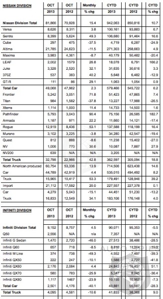 NOTE: To ensure consistency in global sales reporting, Nissan North America calculates monthly variances on a straight-percentage basis, unadjusted for the number of selling days. October 2013 had 27 selling days, while October 2012 had 26 selling days.