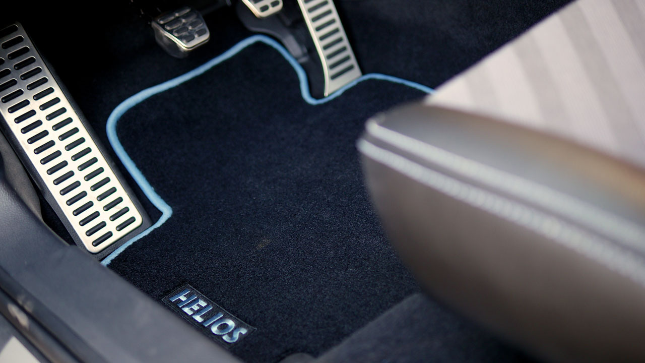 Larger Golf R brake calipers custom painted with the "Helios" logo replace the stock pieces and 19-inch Volkswagen Motorsports wheels coated in ceramic gunmetal gray and wrapped with Nitto Invo 235/35 ZR-rated tires are employed on all four corners. A custom exhaust system was also added for more style and a performance sound.