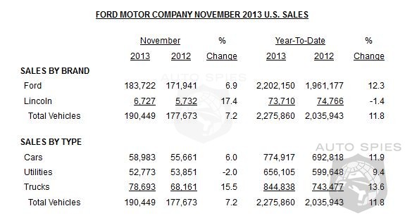 Ford Motor Company's November U.S. sales of 190,449 vehicles are up 7 percent overall compared with last year. Retail sales are up 9 percent, for the best November performance since 2004. The November retail sales performance of 147,021 vehicles reflects broad-based gains, with passenger cars up 6 percent, utilities up 3 percent and trucks up 17 percent. Ford passenger cars achieved the best November retail sales result since 2002, with Ford Fusion and Ford Fiesta both posting records.
