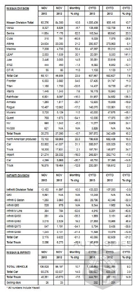 NOTE: To ensure consistency in global sales reporting, Nissan North America calculates monthly variances on a straight-percentage basis, unadjusted for the number of selling days. November 2013 had 26 selling days, while November 2012 had 25 selling days.