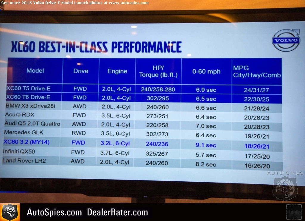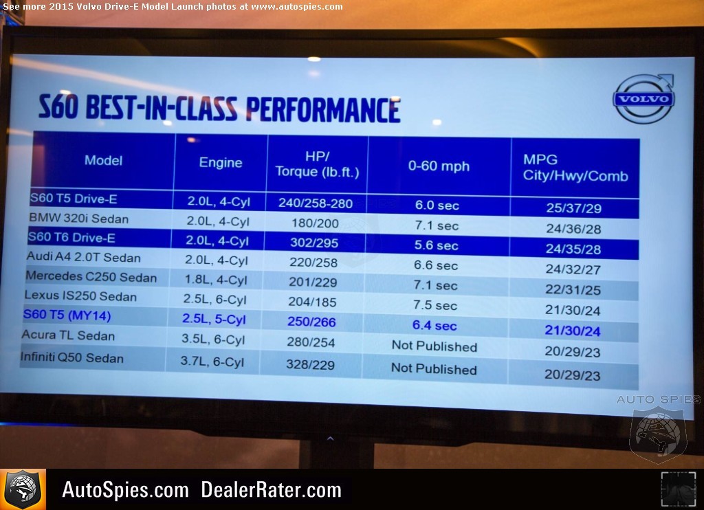 But safety isn't the company's value add these days. If you were wondering what "Drive-E" means, it stands for "Drive Efficiently." If you're skeptical, check out the two images 001 snapped from Volvo's press conference about the new powertrains it's featuring in the 2015 MY products. Not only does it perform, it also earns a healthy mpg figure.