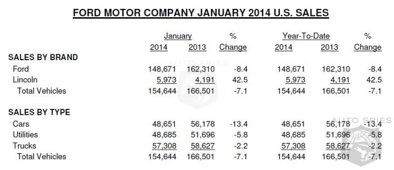 Ford Motor Company January sales of 154,644 total vehicles are down 7 percent from a year ago, while retail sales of 113,721 vehicles are off 5 percent. Ford Mustang and Lincoln brand vehicles posted gains in the first month of 2014.“Given the difficult weather in our largest sales regions, we are fortunate to have held in at retail as well as we did,” said John Felice, Ford vice president, U.S. marketing, sales and service. “In areas where the weather was good, such as in the West, sales were up. The poor weather also had an impact on the timing of some of our fleet deliveries. A bright spot is Lincoln, which had its strongest sales in four years.”