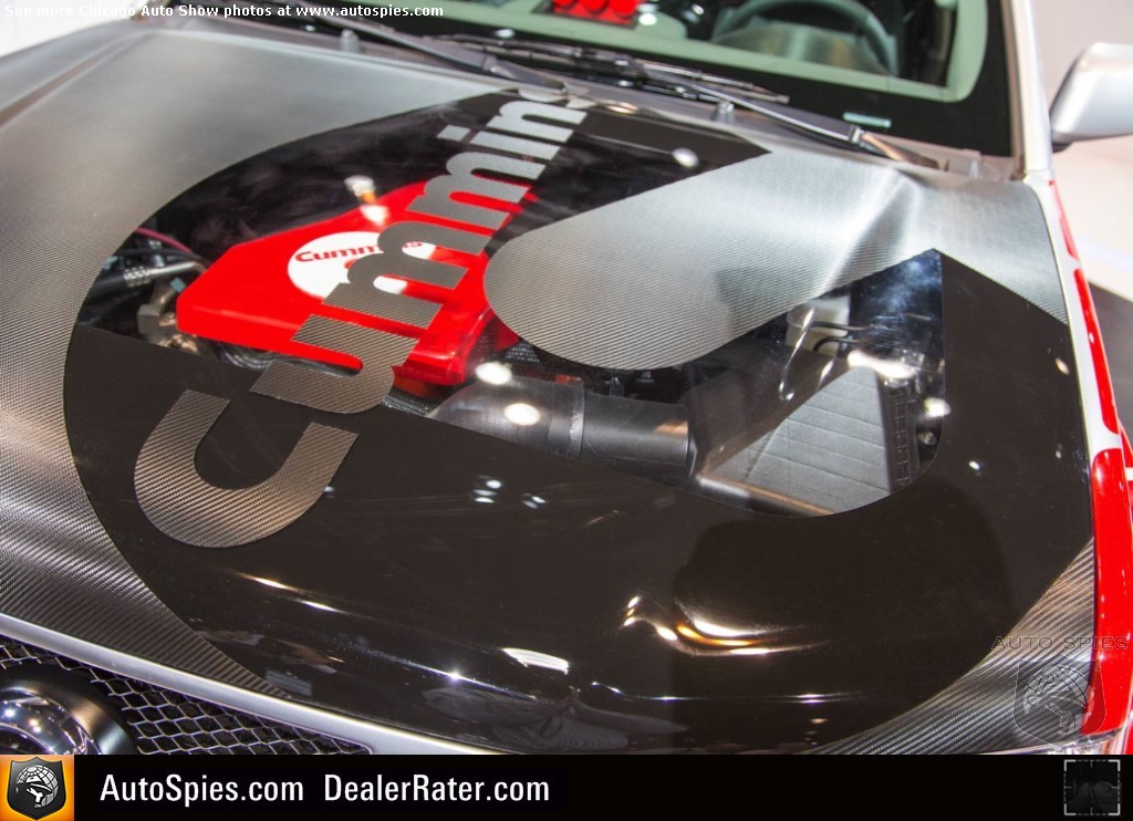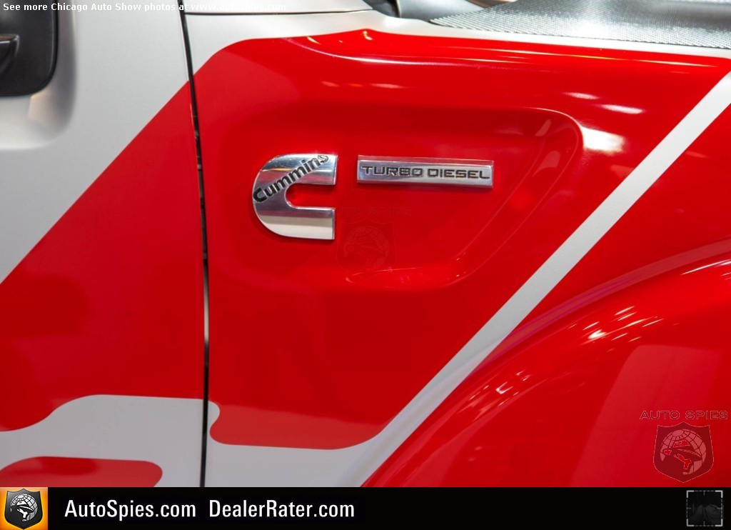 Along with carbon film-coated features such as the chin spoiler, mesh grille, roof rack, aerodynamic full-bed tonneau cover and tailgate spoiler, the hood of the vehicle draws special attention. A partially transparent acrylic hood insert serves as a window to the engine bay, where all powertrain-related elements continue the red theme. The special carbon fiber engine cover, seen through the hood insert, features an oversize Cummins logo, with a red center, black carbon sides and hidden illumination. "Cummins Turbo Diesel badges" are also recessed into both front fenders.