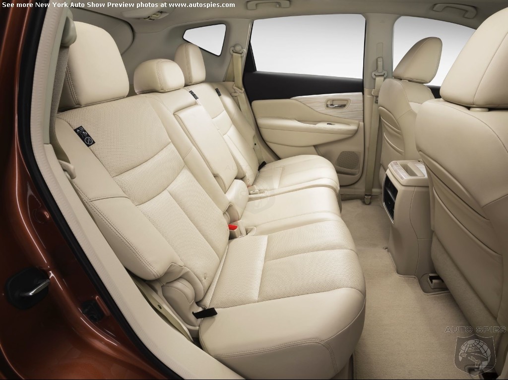 The new Murano's cargo area has been reconfigured (versus the previous generation) to provide a projected best storage space in the segment (with seats up). The rear cargo area, for example, accommodates four large suitcases, while the rear seats fold flat for greater cargo convenience. With the easy rear seat release and available power rear seat return, Murano converts from people hauler to cargo ship or back within seconds. All configurations can be done from the back, with no walking to each door.