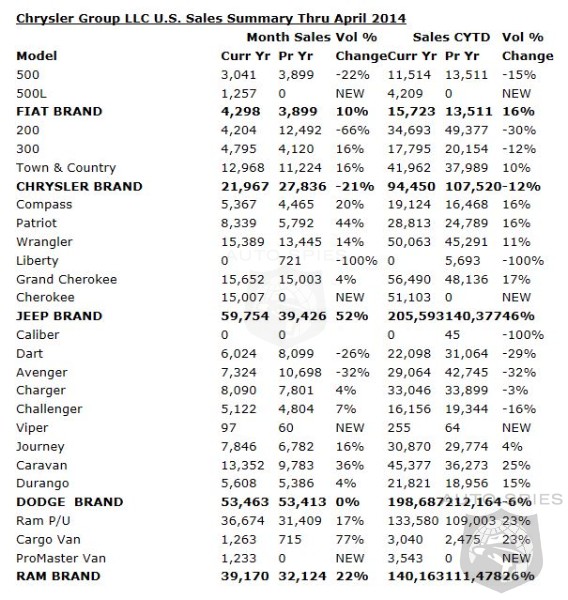 Chrysler Group LLC today reported U.S. sales of 178,652 units, a 14 percent increase compared with sales in April 2013 (156,698 units), and the group’s best April sales since 2007.