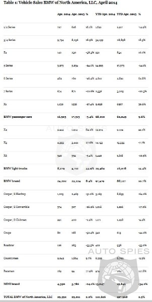 The BMW Group in the U.S. (BMW and MINI combined) reported April sales of 29,592 vehicles, an increase of 2.0 percent from the 29,011 vehicles sold in the same month a year ago. Year-to-date, the BMW Group (BMW and MINI combined) is up 2.5 percent on sales of 110,626 in the first four months of 2014 compared to 107,968 in the same period in 2013.