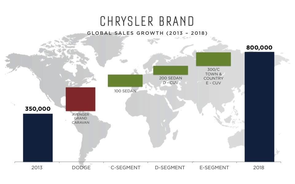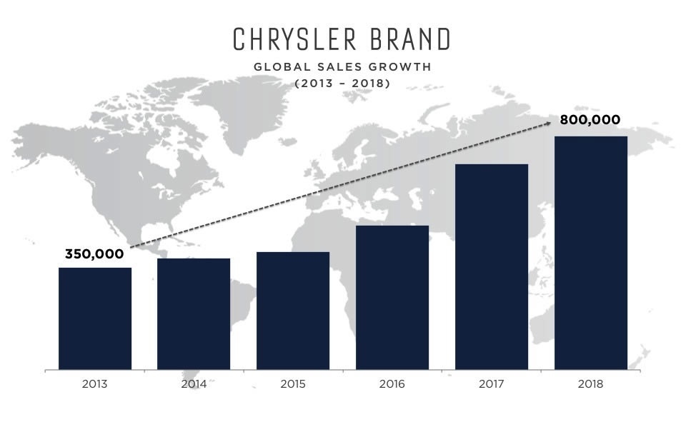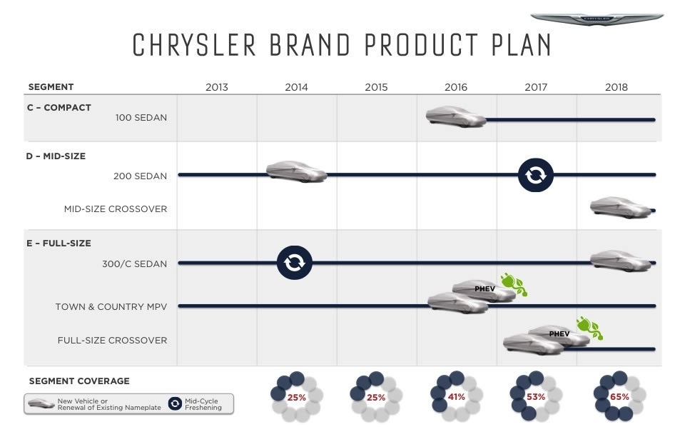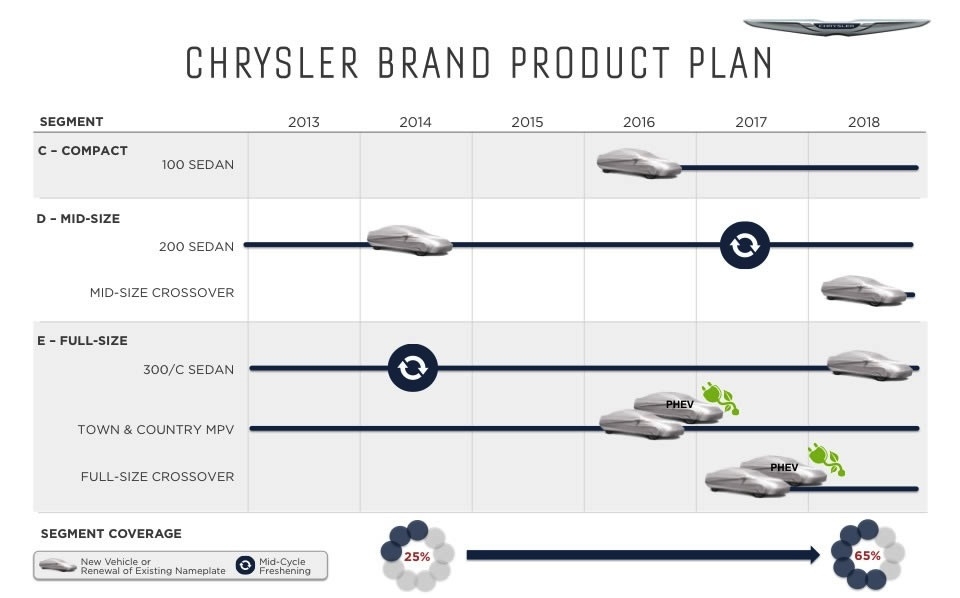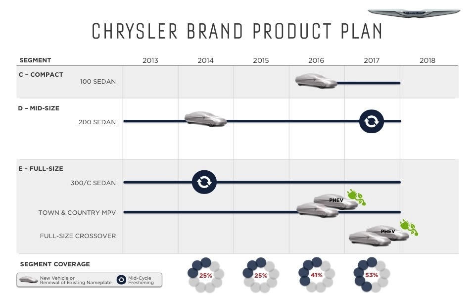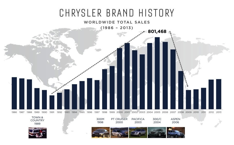 If you were like most of us you had given up hope for Chrysler as it faced the second bailout in the brand's seesaw history. But salvation came not only in the form of a US bailout but leadership from another unlikely source, Fiat. The leadership and forward thinking of Fiat was just what it took to turn the company around and just a few short years later we see a new Chrysler.Now the question is how do you grow when you only offer 3 models? A new compact sedan labeled the 100 rolls out in 2016 A full-sized crossover in 2017A mid-sized crossover in 2018. The Chrysler Town & Country minivan will be redesigned in Fiat Chrysler also debut a new plug-in hybrid version of the Town & Country and a plug-in crossover in 2017. Chrysler's ambitious plan is to grow from its 2013 level of 350,000 sales to 800,000 units in 2018.