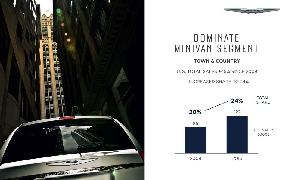 The Chrysler Town & Country minivan will be redesigned in Fiat Chrysler also debut a new plug-in hybrid version of the Town & Country and a plug-in crossover in 2017. Chrysler's ambitious plan is to grow from its 2013 level of 350,000 sales to 800,000 units in 2018.