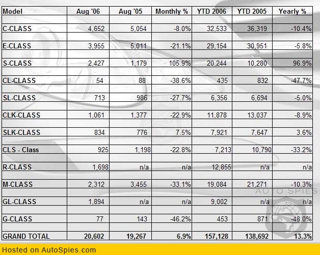 Mercedes-Benz USA (MBUSA) today reported its highest August on record with sales of 20,602 new vehicles, an increase of 6.9 percent over last August. This brings MBUSA’s year-to-date sales to 157,128 a 13.3 percent increase over year-to-date 2005.
