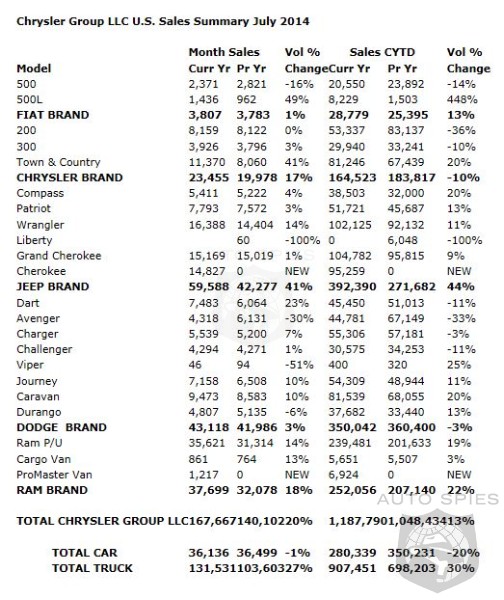 August 1, 2014 , Auburn Hills, Mich. - Chrysler Group LLC today reported U.S. sales of 167,667 units, a 20 percent increase compared with sales in July 2013 (140,102 units), and the group’s best July sales since 2005.