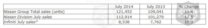 Nissan Group today announced total U.S. sales for July 2014 of 121,452 units, an increase of 11.4 percent over the prior year and a July record.Nissan highlights: