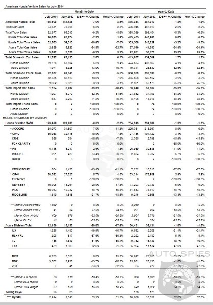 American Honda Motor Co., Inc. today reported July 2014 Honda and Acura vehicle sales of 135,908 units. The Honda division posted sales of 123,428 units in July while Acura sold 12,480 units in the same period. Year-to-date American Honda sales reached 875,344 units.