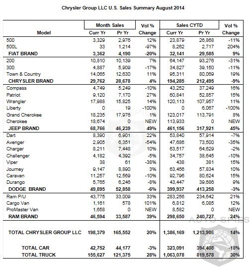 Chrysler Group LLC today reported U.S. sales of 198,379 units, a 20 percent increase compared with sales in August 2013 (165,552 units), and the group's best August sales since 2002.