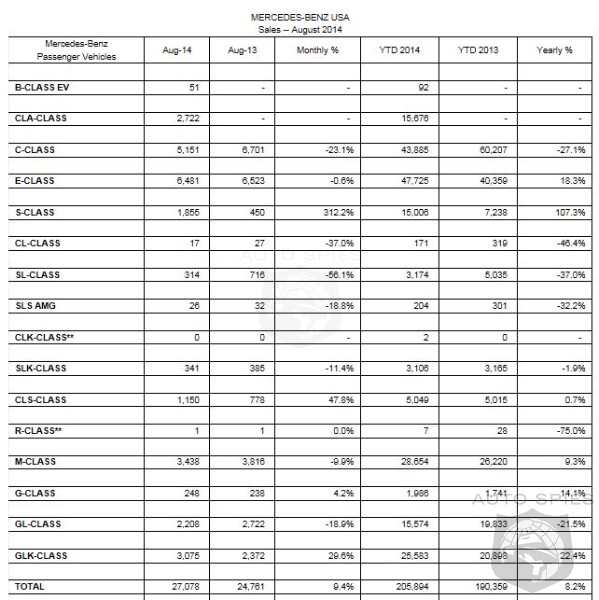 Separately, Mercedes-Benz Certified Pre-Owned (MBCPO) recorded sales volumes of 13,018 vehicles in August, up 40.6% from the 9,261 units sold during the same month last year. On a year-to-date basis, MBCPO sold 79,704 units, an increase of 20.3% from the 66,241 vehicles sold through August 2013.