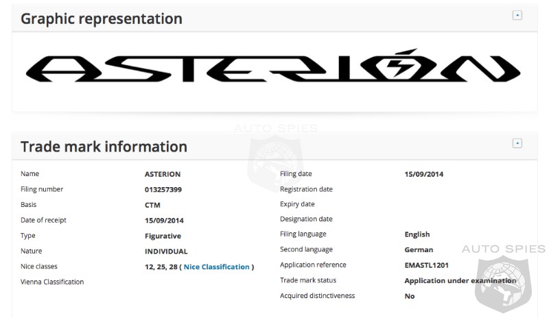 1) Note that the logo features what appears to be a lightning bolt passing through the "o" in Asterion — could it be a vehicle featuring a hybrid or electric powertrain?
