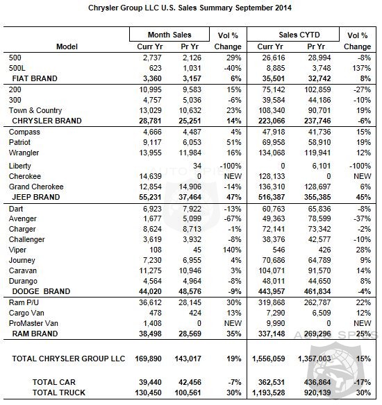 Chrysler Group LLC today reported U.S. sales of 169,890 units, a 19 percent increase compared with sales in September 2013 (143,017 units), and the group's best September sales since 2005.