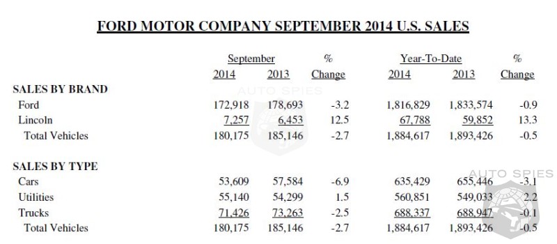 Ford Motor Company U.S. sales totaled 180,175 vehicles in September, down 3 percent from a year ago. Retail sales of 137,297 vehicles increased 2 percent.