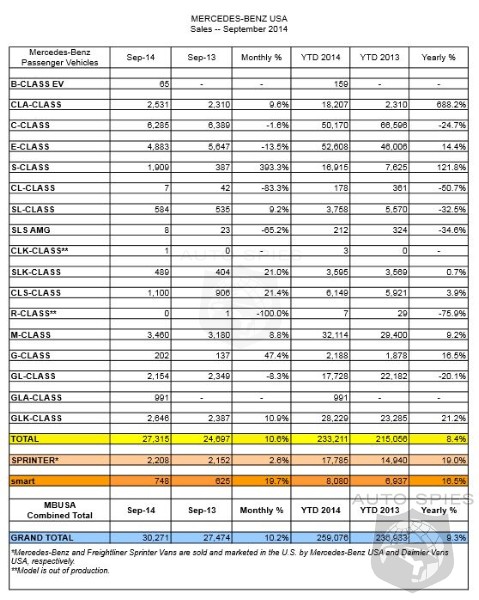 Mercedes-Benz today reported the best September sales in its history with 27,315 units sold across its passenger car and light truck lineups, increasing 10.6% from the 24,697 vehicles sold in September 2013. Sprinter sales totaled 2,208 for the month, combining with 748 retails at smart (up 19.7%) to bring total September volumes at Mercedes-Benz USA (MBUSA) to 30,271, an increase of 10.2%. Year-to-date sales for Mercedes-Benz reached 233,211*, up 8.4%. Adding volumes of 17,785 for Sprinter and 8,080 for smart, MBUSA achieved a year-to-date grand total of 259,076.