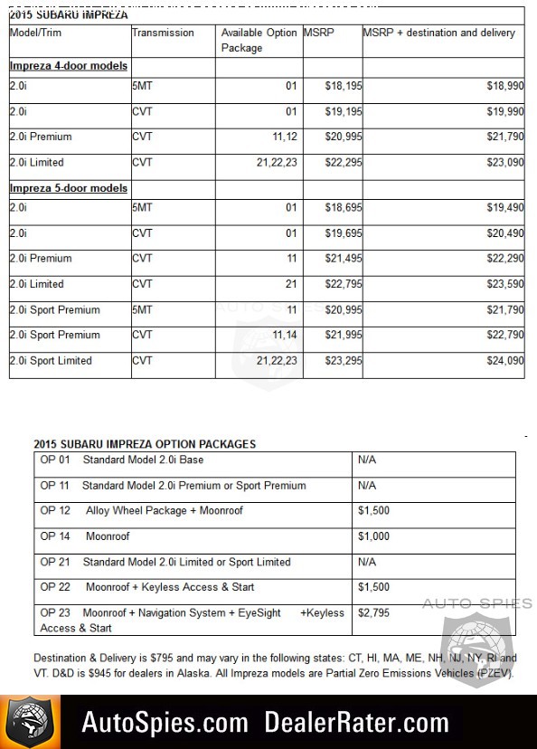 SUBARU ANNOUNCES PRICING ON 2015 IMPREZA® MODELS