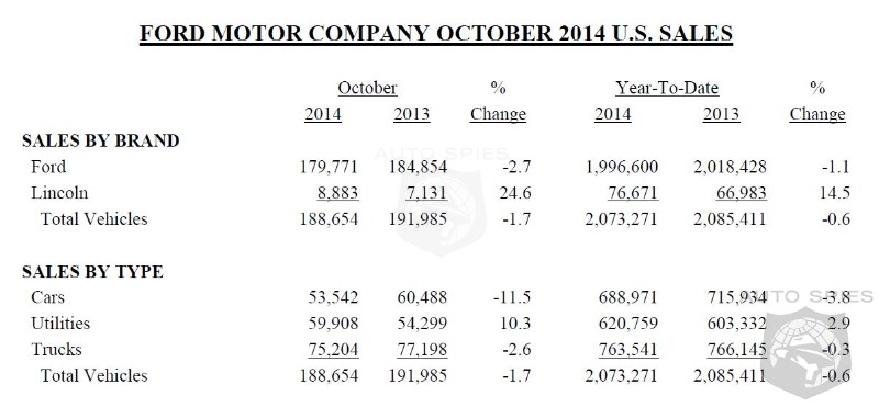 Ford Motor Company U.S. sales totaled 188,654 vehicles in October, down 2 percent from a year ago. Daily rental business declined 13 percent, while government and commercial sales were up 4 and 18 percent, respectively.