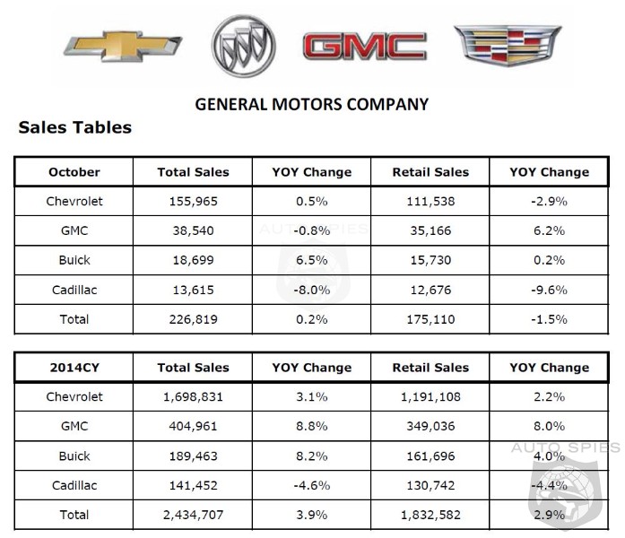 General Motors Co. (NYSE: GM) dealers delivered 226,819 vehicles in the United States in October for the company’s best October sales in seven years. Chevrolet sales were up year over year on the strength of the Silverado, Cruze, Traverse and Equinox, and Buick had its best October in more than a decade. Total company sales a year ago were 226,402 units.“The U.S. economy has steadily improved all year and now we are poised for a stronger expansion backed by an improved job market, higher consumer confidence and lower fuel prices,” said Kurt McNeil, U.S. vice president of Sales Operations. “We have a strong hand to play, with the industry’s newest and most complete line-up of pickups and SUVs, class-leading crossovers like the Buick Encore and a wealth of new products in the pipeline.”